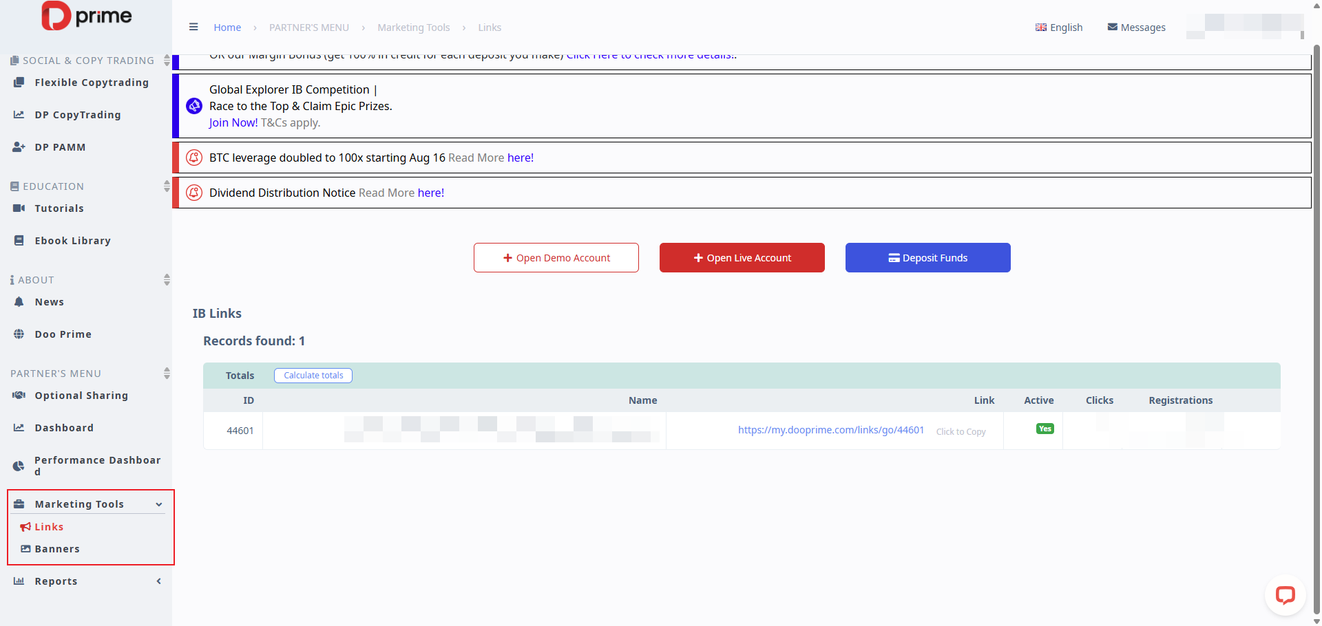 - ضمن قسم "أدوات التسويق"، ستجد روابط الإحالة واللافتات التسويقية الخاصة بـ IB لاستخدامها في أنشطتك التسويقية.